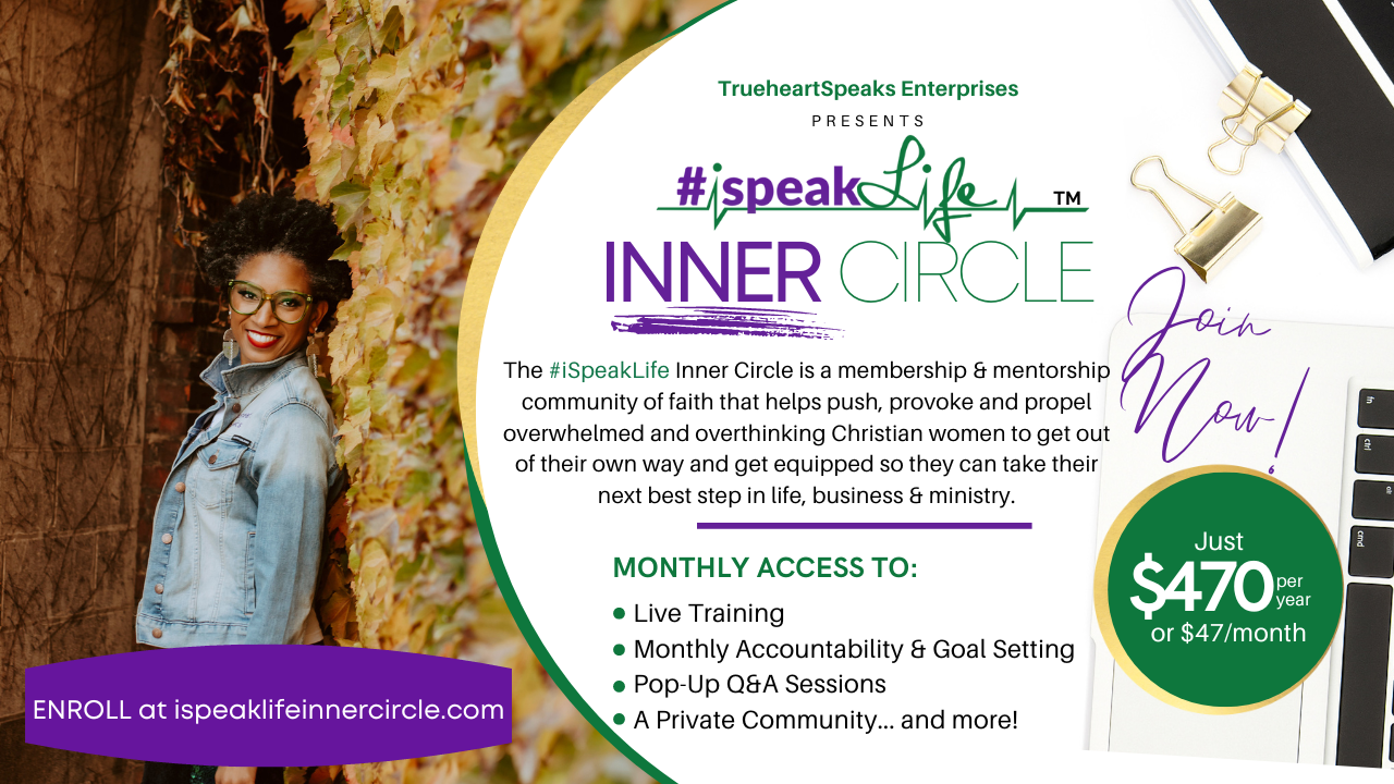The #iSpeakLife Inner Circle is a membership & mentorship community of faith that helps push, provoke and propel overwhelmed and overthinking Christian women to get out of their own way and get equipped so they can take their next best step in life, business and ministry.