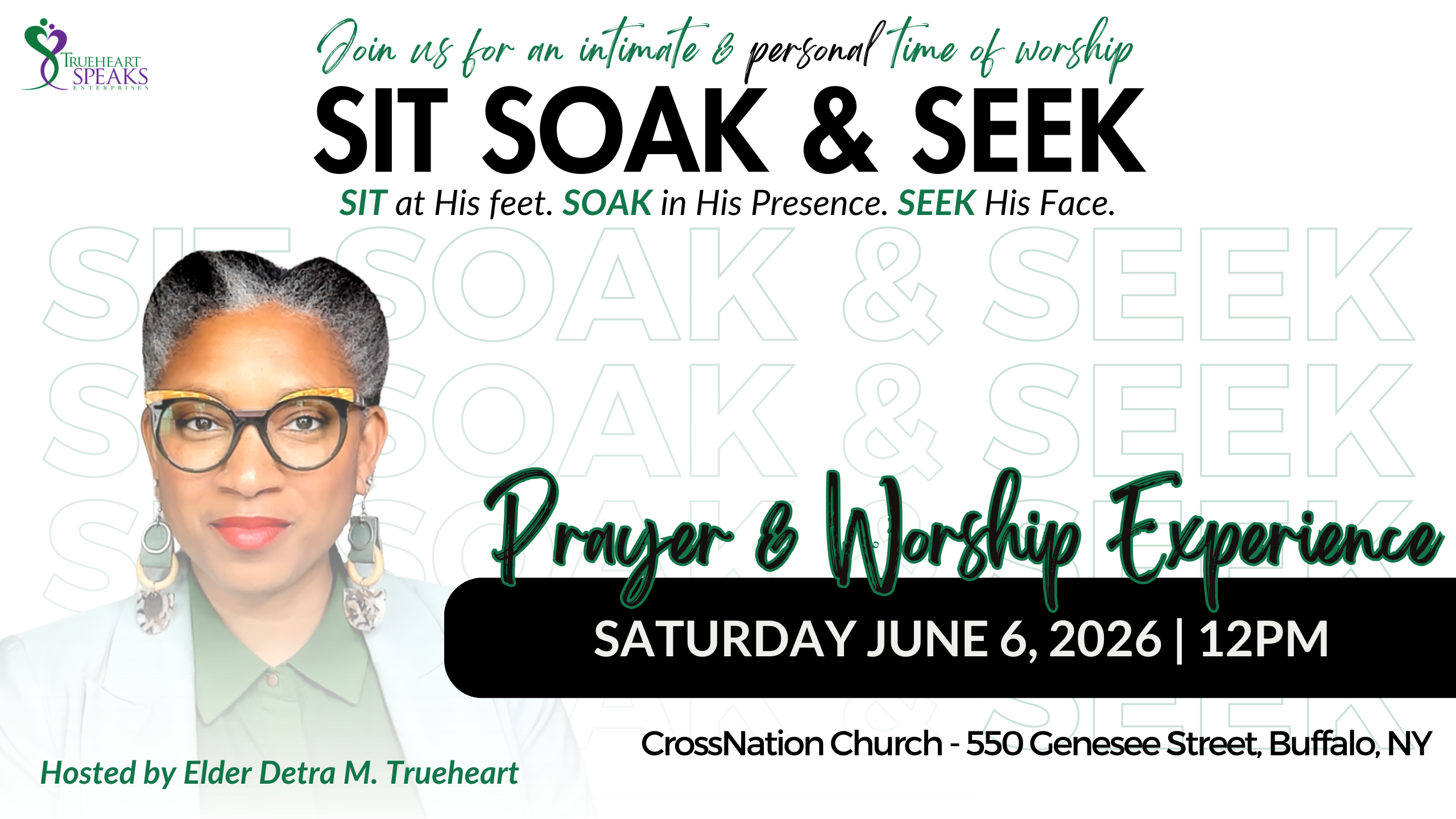 In this season and this hour, God wants time with YOU. He is calling for more intimacy and communion with His sons and daughters. If you've been yearning for more undivided time with Him, then plan to join us for Sit Soak & Seek. Â